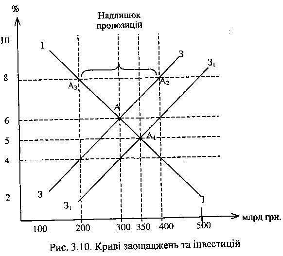 П р и к л а д. Упроекті бюджету України на 1996 р. передбачалося мобілізувати на грошовому ринку 160,0 трлн. крб для покриття бюджетного дефіциту. На початок 1996 р. усі ресурси банків України становили приблизно 570,0 трлн. крб. При затвердженні Верховною Радою бюджету в запропонованому вигляді більше чверті всіх ресурсів банківської системи було б мобілізовано на потреби бюджету, що остаточно підірвало б базу кредитно-інвестиційної діяльності банків. Це стало однією з причин повернення проекту бюджету на доопрацювання.