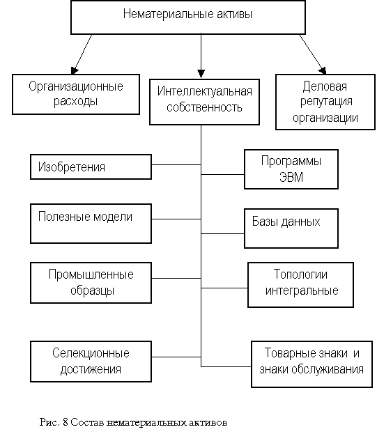 *Журнал "Эксперт" №10 (70) от 12 марта 2001 года Наименование места происхождения товара или услуги - это всегда географическое название страны, населенного пункта, местности, где произведен продукт или услуга. Согласно правилам отечественного учета, в состав нематериальных активов включаются организационные расходы. К организационным расходам относятся гонорары юристам за составление учредительных документов, услуги за регистрацию фирмы и так далее, осуществляемые в момент создания. Расходы по переоформлению учредительных документов, изготовление новых печатей и штампов состав нематериальных активов не включаются. Такой вид нематериальных активов, как деловая репутация (гудвилл). появляется у предприятия только в том случае, если им была совершена покупка другого предприятия. Деловая репутация может определяться в виде разницы между покупной ценой приобретенного предприятия и стоимостью по бухгалтерскому балансу всех его активов и обязательств. Нематериальные активы неоднородны по своему составу,· по характеру использования в процессе производства, по степени влияния на финансовое состояние и результаты хозяйственной деятельности предприятия. Поэтому необходима классификация, которая может быть произведена по ряду признаков. По признаку использования в производстве нематериальные активы можно разделить на функционирующие (работающие) объекты, применениекоторых приносит предприятию доход в настоящий период; нефункционирующие (неработающие) объекты, которые не используются по каким-либо причинам, но могут применяться в будущем. По степени влияния на финансовые результаты предприятия выделяются объекты нематериальных активов, способные приносить доход прямо, за счет внедрения их в эксплуатацию и объекты, опосредованно влияющие на финансовые результаты. В зависимости степени правовой защищенности одна часть нематериальных активов относится к защищаемым охранными документами (авторскими правами), другая – к разряду не защищенных охранными документами (авторскими правами). Тестовый контроль 1. Можно ли включить литературное произведение в состав нематериальных активов? 2. Товарные знаки включаются в состав 3. Ценность нематериальных активов для предприятия заключается в том, что их использование