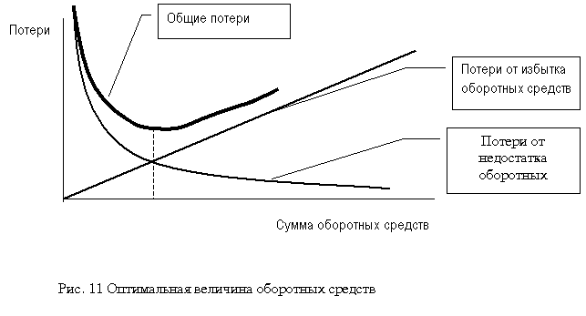 МОДУЛЬ 4.3. МЕТОДЫ ОПРЕДЕЛЕНИЯ ПОТРЕБНОСТИ В ОБОРОТНЫХ СРЕДСТВАХ Эффективное использование оборотных средств во многом зависит от правильного определения потребности в оборотных средствах. Занижение величины оборотных средств влечет за собой неустойчивость финансового положения, перебои в производственном процессе и снижение объемов производства и прибыли. Завышение размера оборотных средств снижает возможности предприятия производить капитальные затраты для расширения производства (рис. 11). Потребность в оборотных средствах зависит от множества факторов: объемов производства и реализации; характера деятельности предприятия; длительности производственного цикла; видов и структуры потребляемого сырья; темпов роста объемов производства и т.п.