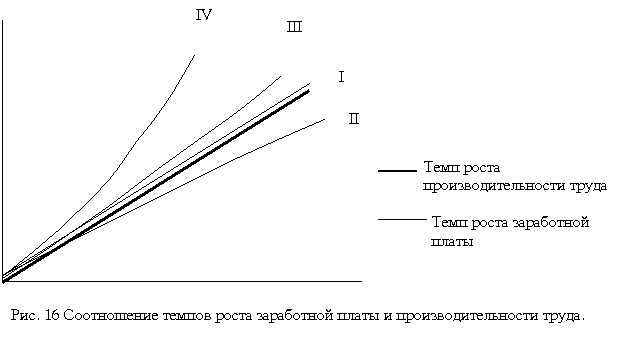 Первую модель (рис. 16, I) можно считать идеальной. В масштабах государства она не порождает инфляции, а для предприятия содержит стимул к повышению производительности труда его работников. На практике такое соотношение поддерживать трудно. Вторая ситуация (рис. 16, II) не должна порождать инфляцию, но не содержит стимула к повышению производительности труда. Если темп роста заработной платы опережает темп роста производительности труда, то такая модель стимулирует рост производительности труда, но порождает инфляцию (рис. 16,III). Слишком высокие темпы роста заработной платы (рис. 16, IV) нарушают связь между затратами труда и его оплатой, что так же приводит к снижению его производительности. Тестовый контроль 1. В каком случае предприятию выгодно использовать повременную форму оплаты труда 2. Основным недостатком простой сдельной системы оплаты труда является то, что 3. Какая зависимость должна постоянно контролироваться на предприятии