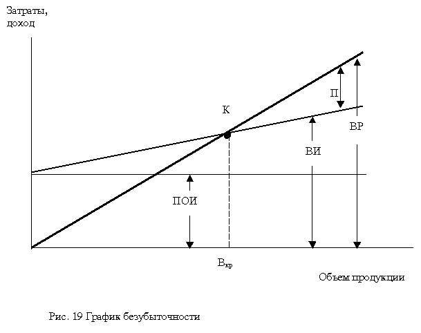 График безубыточности в различных его модификациях широко используется в современной экономике. Несомненным преимуществом этого метода является то, что с его помощью можно быстро получить довольно точный прогноз основных показателей деятельности предприятия при изменении условий на рынке. При построении графика безубыточности предполагается, что не происходит изменений цен на сырье и продукцию за период, на который осуществляется планирование; постоянные издержки считаются неизменными в ограниченном диапазоне объема продаж; переменные издержки на единицу продукции не изменяются при изменении объема продаж; продажи осуществляются достаточно равномерно. При построении графика по горизонтальной оси откладывается объем производства в единицах изделий или в процентах использования производственной мощности, а по вертикальной - затраты на производство и доход. Затраты откладываются с подразделением на постоянные (ПОИ) и переменные (ПИ). Кроме линий постоянных и переменных издержек, на графике отображаются валовые издержки (ВИ) и выручка от реализации продукции (ВР). Точка пересечения линий выручки и валовых затрат представляет собой точку безубыточности (К). Эта точка интересна тем, что при соответствующем ей объеме производства и продаж (Вкр) у предприятия нет ни прибыли, ни убытков. Объем производства, соответствующий точке безубыточности носит название критического. При объеме производства меньше критического предприятие своей выручкой не может покрыть затраты и, следовательно, результатом его деятельности являются убытки. Если объем производства и продаж превышает критический, предприятие получает прибыль. Точка безубыточности может быть определена и аналитическим методом.