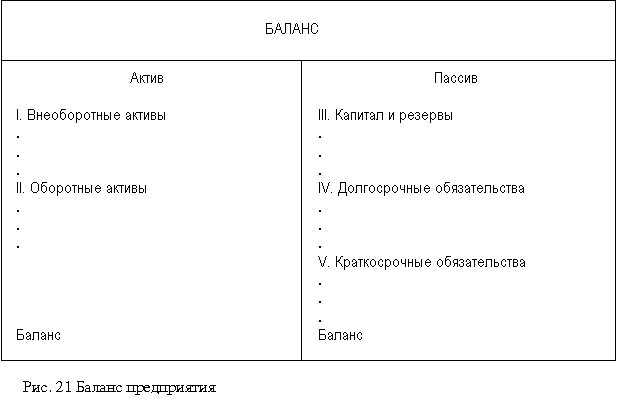 МОДУЛЬ 8.1. БУХГАЛТЕРСКАЯ ОТЧЁТНОСТЬ Бухгалтерская отчетность состоит из бухгалтерского баланса, отчета о прибылях и убытках, приложений к ним и пояснительной записки. Основная информация содержится в бухгалтерском балансе, который характеризует финансовое положение организации по состоянию на отчетную дату. По своей форме бухгалтерский баланс представляет таблицу, в которой, с левой стороны (в активе), отражаются средства предприятия, а с правой (в пассиве) – источники их образования. Пассив, от латинского passivus, означает бездеятельный. Бездеятельный в данном случае означает, что в денежной форме финансовые ресурсы и капитал не могут принести предприятию требуемых доходов. Актив, от латинского aktivus, означает деятельный. Актив баланса включает два, а пассив – соответственно три раздела (рис. 21).