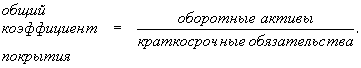 По оценкам, принятым в международной практике, значение коэффициента должно быть 0,8 - 1. 3. Общий коэффициент покрытия, который часто называют просто коэффициентом покрытия, дает общую оценку платежеспособности предприятия. Коэффициент покрытия представляет интерес для покупателей и держателей акций и облигаций предприятия. Его вычисляют по формуле