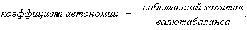 Нормальное значение этого коэффициента составляет 2,0-2,5. Финансовую устойчивость и автономность отражает структура баланса (соотношение между отдельными разделами актива и пассива), которая характеризуется несколькими показателями. 1. Коэффициент автономии характеризует зависимость предприятия от внешних займов. Чем ниже значение коэффициента, тем больше займов у компании, тем выше риск неплатежеспособности. Низкое значение коэффициента отражает также потенциальную опасность возникновения у предприятия дефицита денежных средств: