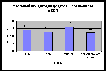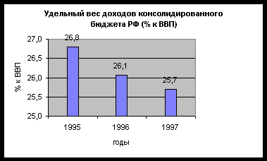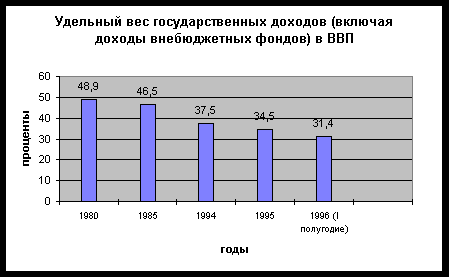 Реформы сопровождаются рядом весьма болезненных последствий, обусловленных недостаточной продуманностью и последовательностью проводимых преобразований. Одним из таких последствий явилось снижение удельного веса валового внутреннего продукта (ВВП) страны, перераспределяемого через бюджетную систему: согласно официальным данным, в 90-х годах произошло снижение уровня таких показателей как: