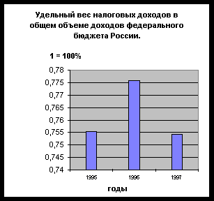 Наиболее важной частью являются налоговые доходы. Это подтверждается официальной статистикой (см. рис. 7). Представленный на рисунке 7 график динамики удельного веса налоговых доходов в общем объеме доходов федерального бюджета России наглядно показывает ведущую роль налоговых доходов бюджета: так начиная с 1995 года их удельный вес в общем объеме доходов составляет более 70%.