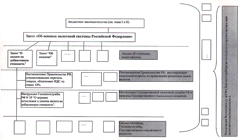 Приведенная на рисунке схема дает общее представление о структуре построения системы российского налогового законодательства. В IV теме при изучении отдельных видов налогов, взимаемых с юридических и физических лиц законы, инструкции, приказы, письма и другие законодательные и нормативные документы будут рассмотрены более подробно.