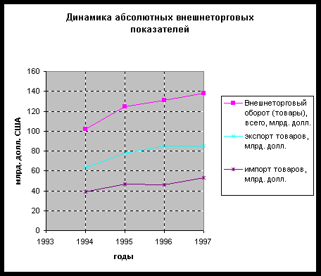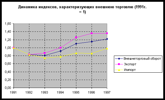 Как видно из рисунков 9 – 11 за годы экономических реформ внешняя торговля стала одной из немногих сфер экономики, вышедшей после падения, пережитого в 1991 - 1992 (частично в 1993) годах, на путь достаточно динамичного развития: так начиная с 1993 года основные показатели (внешнеторговый оборот, экспорт и импорт) демонстрируют устойчивый рост. Произошедшее снижение этих показателей в 1997 году и первой половине 1998 года объясняются неблагоприятной конъюнктурой на мировых рынках.