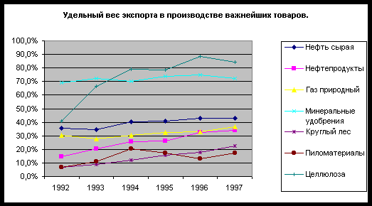 Это убедительно подтверждают статистические данные приведенные на рисунке 12, которые свидетельствуют о том, что с 1992 года происходит рост удельного веса экспорта в общем объеме производства ряда важных для российской экономики топливно-энергетических и сырьевых товаров.