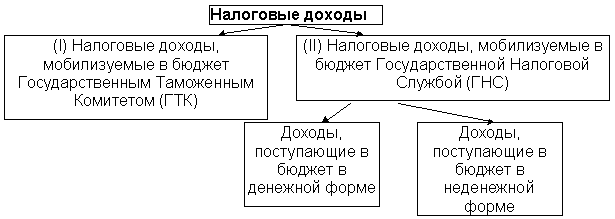 Кроме классификации, представленной во втором способе, целесообразно заметить, что налоговые доходы, мобилизуемые в бюджет Государственной налоговой службой, могут быть разделены на доходы, поступающие в бюджет в денежной форме, и в неденежной форме (например, казначейские налоговые освобождения (КНО), различные зачеты). [Начиная с 1 января 1998 года в соответствии с Указом Президента РФ такого рода поступления в федеральный бюджет отменены. Вместе с тем, при изучении предлагаемого курса важно представлять, что поступление в бюджет налоговых доходов во многом обусловлено существующим в России кризисом неплатежей. И проблемы, вызванные кризисом неплатежей не могут быть решены указами, отменяющими, например, поступление средств в бюджет в неденежной форме.]