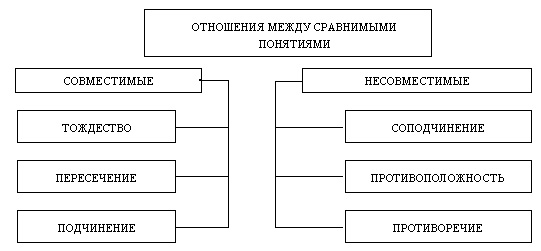 Так как все предметы мира находятся во взаимодействии и взаимообусловленности, то и понятия, отражающие предметы мира, также находятся в определенных отношениях. Конкретные виды отношений устанавливаются в зависимости от содержания и объема понятий, которые сравниваются.