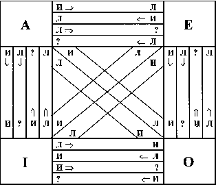 Умозаключение по логическому квадрату это такой вид непосредственных умозаключений, который позволяет получать выводы, учитывая правила соотношений истинности - ложности между категорическими суждениями А, Е, I, О. Отношения между данными суждениями, как уже указывалось, иллюстрированы схемой логического квадрата. При этом устанавливается следование истинности или ложности одного суждения из истинности или ложности другого суждения в соответствии с теми логическими законами, которые проявляют себя в соответствующих отношениях. Используя схему логического квадрата, в общем виде это можно представить таким образом.