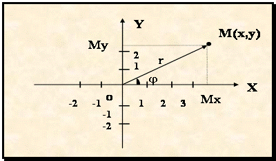 Обозначим через j угол, образованный ОМ с положительным направлением оси Ох, и через r - его длину, тогда можно координаты точки определить следующим образом: