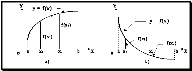 Определение 10.1. Функция f(х) возрастает на промежутке <a,b>, если из того, что х2 > x1 Þ f(х2) > f(х1) " x1,x2 Î <a,b>. И f(х) убывает на промежутке <a,b>, если х2 > x1 Þ f(х2) < f(х1) " x1,x2 Î <a,b>.