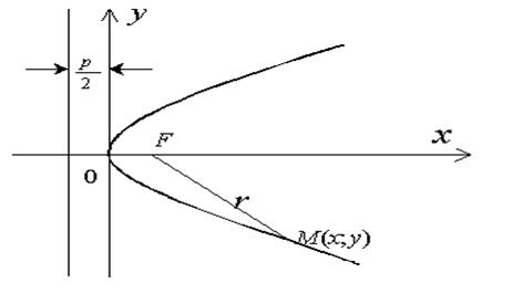 Пусть дана некоторая парабола. Введем декартову прямоугольную систему координат так, чтобы ось абсцисс проходила через фокус данной параболы перпендикулярно директрисе и была направлена от директрисы к фокусу. Начало координат расположим посредине между фокусом и директрисой (Рис. 2.14.1). В этой системе координат данная парабола будет определяться уравнением: