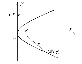Пусть дана некоторая парабола. Введем декартову прямоугольную систему координат так, чтобы ось абсцисс проходила через фокус данной параболы перпендикулярно директрисе и была направлена от директрисы к фокусу. Начало координат расположим посредине между фокусом и директрисой (Рис. 2.14.1). В этой системе координат данная парабола будет определяться уравнением: