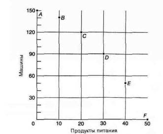 Давайте рассмотрим один существенный пример: выбор между производством продуктов питания и машин. В таблице 1А-1 представлены важные для PPF данные, которые близки к примеру, показанному в таблице 1-1. Вспомните, что каждая из возможностей дает один объем производства продуктов питания и один объем производства машин. С увеличением выпуска продуктов питания падает производство машин. Таким образом, если экономическая система производит 10 единиц продуктов питания, то она может сделать максимум 140 машин, но если выпуск пищи равен 20 единицам, то можно произвести только 120 машин.