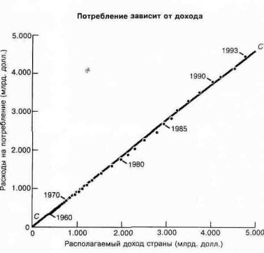 Рис. 1А-8. Точечная диаграмма функции потребления иллюстрирует важный закон макроэкономики Наблюдаемые точки расходов на потребление располагаются вблизи прямой СС, которая показывает усредненную динамику. Так, точка для 1990 года, лежит так близко к линии СС, что по этой линии можно было с точностью, еще до конца года, предсказать ее местоположение. Точечные диаграммы позволяют нам увидеть, насколько тесная зависимость существует между двумя переменными |