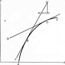 Построив касательную мы можем подсчитать наклон кривой в данной точке. Таким образом линия FBMJ является касательной к плавной кривой ABD в точке В. Наклон в точке В подсчитывается как наклон касательной, т.е. как NJ/MN