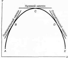 Многие кривые в экономике сначала возрастают, достигают максимума, а затем убывают. От А до С, в области возрастания кривой, наклон ее положителен (см. точку В). В области снижения кривой, от С до Е, наклон ее отрицателен (см. точку D). В точке максимума кривой — точке С, наклон равен 0. (Что же можно сказать об U-об-разной кривой ? Чему равен ее наклон в точке минимума?)