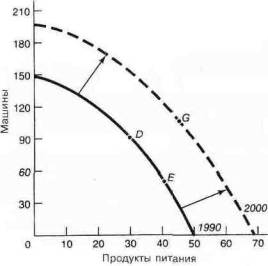 Представим себе, что нижняя PPF показывает производственные возможности общества на 1990 год. Если мы вернемся к этой же стране в 2000 году, мы увидим, что PPF сдвинулась от нижней кривой 1990 года к верхней кривой 2000 года. (Этот сдвиг произойдет из-за технического прогресса или из-за того, что ресурсов труда или капитала станет больше.) В последующие годы общество может переместиться на позицию G, где будет производиться больше машин и продуктов питания, по сравнению с D и Е.