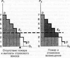 Диаграммы на рисунках выражают полезность, получаемую индивидом, который может находиться в нескольких возможных состояниях. Левые диаграммы в каждой паре представляют благополучно завершившиеся годы, правые — демонстрируют последствия пожаров для потребления индивида. По части (а) видно, что не застраховавшийся человек получит много выгоды, если пожара не произойдет, но подвергнет себя огромному ущербу, если он случится. В части (б), домовладелец в незначительной степени жертвует своим потреблением, но остается в большем выигрыше в случае пожара. Ожидаемый выигрыш представлен темным участком