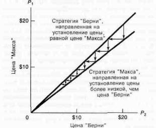 Начнем с рассмотрения процесса взаимного сбивания цены. Допустим, вы — глава одного из универмагов «Берни» (Вегпеу), расположенного в Нью-Йорке. Ваш лозунг—«Дешевле не бывает». Ваш коварный соперник, «Макс фифе авеню» (Max Fifth Avenue), ведет рекламную компанию под девизом «Наши цены на 10% ниже». Рис. 11-4 иллюстрирует, как будут развиваться события. Вертикальные стрелки изображают динамику цен «Макса». Горизонтальные—ваши ответные действия на каждое понижение.