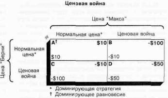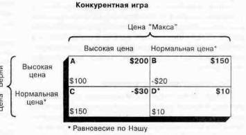 Таблица выигрышей показывает прибыль универмагов при различных стратегиях. "Берни" стоит перед выбором между двумя стратегиями, представленными в двух строках таблицы. Двум стратегиям "Макса" соответствуют два столбца. Цифры в ячейках означают прибыли игроков. К примеру, "Берни" выбирает стратегию «ценовая война», а "Макс" —стратегию «нормальная цена». Результат отображен в ячейке С. «Выигрыш» "Берни" равен — 100 долл., «выигрыш» "Макса" равен — 10 долл. Обсудив все варианты, можно прийти к выводу, что равновесие установится в ячейке А соперника в той же степени, что и от своего собственного поведения.