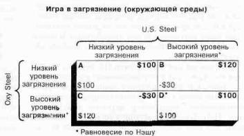 Вступив в смертоносную экономическую игру, каждая неконтролируемая государством и максимизирующая прибыль сталелитейная фирма будет производить загрязнения воды и воздуха. Если какая-либо фирма попытается очищать свои выбросы, то тем самым она будет вынуждена повысить цены и потерпеть убытки. Некооперативное поведение установит равновесие по Нэшу в условиях высоких выбросов (ячейка D). Правительство может предпринять меры с тем, чтобы равновесие переместилось в ячейку А. В этом положении загрязнение будет незначительным, прибыли же останутся теми же