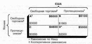 Япония и Соединенные Штаты могут посредством кооперации (заключения соглашения) прийти к равновесию в точке А, в которой они устраняют все тарифы и квоты и извлекают выгоды из свободной торговли. Однако каждая их этих стран может подвергнуться искушению «обмана» посредством введения торговых ограничений на импорт; эти ограничения увеличат доход данной страны и уменьшат мировой доход, что отображается движением к ячейке В или С. Ответная протекционистская реакция другой страны приводит к наихудшей ситуации, показанной в ячейке D