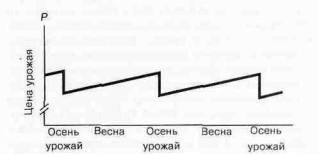 Существует только одно распределение цен по месяцам, при котором экономическая прибыль конкурентных спекулянтов будет сведена к нулю. Ясно, что цена не будет постоянной в течение года. Наиболее низкой цена окажется осенью, сразу после сбора урожая, затем она начнет постепенно повышаться и достигнет своего пика как раз перед следующим сбором. Рост цен будет происходить таким образом, чтобы можно было компенсировать издержки на хранение и на выплату банковских процентов (точно так же терри-ториальное различие в ценах будет зависеть от величины транспортных издержек). Рис. 11-1 демонстрирует идеализированную модель изменения цен в течение года.