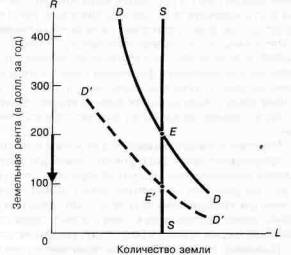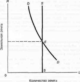 1. Отдача от фиксированных производственных факторов (т.е. факторов, предложение которых постоянно) типа земли называется чистой экономической рентой или просто рентой. Поскольку линия предложения земли вертикальна и совершенно неэластична, земельная рента зависит исключительно от кривой спроса на землю. ,