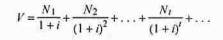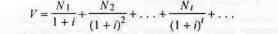 6. Точная формула настоящей ценности выглядит так: каждый доллар, выплачиваемый в течение t лет, начиная от текущего периода времени, является настоящей ценностью (V) следующего выражения: 1/(1 + i)^t. Таким образом для любого потока (последовательности) чистых выплат (Ni,N2,...,Nt,...), где nt есть денежная (долларовая) ценность выплат, получаемых через t лет, мы имеем: