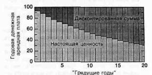 где V — настоящая ценность земли (в долл.); N — постоянные годовые выплаты (в долл. за год); i — процентная ставка в десятичных единицах (например, она может быть равна 0,05 или 5/100 в год). Полученный результат означает, что если процентная ставка всегда равна 5% годовых, то актив, приносящий постоянный приток дохода, будет продаваться на рынке ровно в 20 (1 : 5/100) раз дороже своего годового дохода. Тогда какой будет настоящая ценность пожизненной ренты, порождающей ежегодный доход, составляющий 100 долларов? При 5%-ной ставке ее настоящая ценность будет равна 2000 долл. (100 : 0,05).