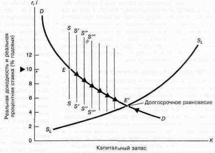 8. Сбережения и инвестиции связаны с ожиданием будущего потребления, а не с сегодняшним потреблением. Взаимодействие бережливости и чистой производительности капитала определяет процентные ставки, норму дохода на капитал и капитальный запас. Фонды или финансовые активы (средства), необходимые для закупки капитала, обеспечиваются домашними хозяйствами, которые готовы отказаться от части сегодняшнего потребления в обмен на увеличение завтрашнего потребления. Спрос на капитал предъявляется фирмами, которые имеют разнообразные косвенные инвестиционные проекты. Таким образом, в долгосрочном равновесии процентная ставка определяется взаимодействием между чистой производительностью капитала и готовностью до-мохозяйств пожертвовать частью сегодняшнего потребления ради увеличения завтрашнего потребления.