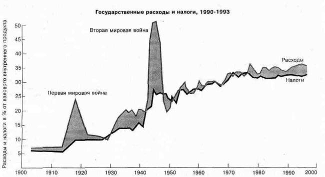 Перед первой мировой войной общие расходы федерального правительства, правительств штатов и местных властей составляли чуть более одной десятой совокупного национального дохода Соединенных Штатов. Во время Второй мировой войны правительство было вынуждено потреблять около половины выпускаемого национального продукта. В начале 1990-х расходы правительства Соединенных Штатов составляли около 35 процентов от валового внутреннего Продукта.