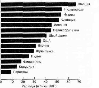 На рис. 16-2 можно увидеть, как различается доля государственных расходов (в процентах от ВВП) в разных странах. Страны, характеризующиеся высоким уровнем дохода, как правило, расходуют большую Часть ВВП, чем более бедные страны. Есть ли общая тенденция среди богатых стран? В странах с высоким уровнем доходов не может существовать единого закона, касающегося налогов и благосостояния граждан, который бы учитывал все многообразие национальных экономических особенностей. Например, финансирование образования и здравоохранения — двух самых больших статей государственных расходов — производится во всех странах по-разному.