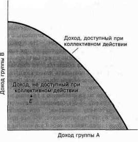 График показывает поведение экономики при наличии коллективного действия и при его отсутствии. Точка Е обозначает результат политики полного невмешательства, когда правительство не строит дорог, не делает прививок детям и вообще «устраняется от дел». При наличии коллективных действий, таких как строительство дорог, поддержка науки, регулирование предложения денег и т.д. доходы должны увеличиваться по мере продвижения общества от точки Е к границе