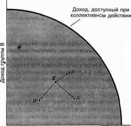 Начиная с точки невмешательства государства Е, мы можем видеть три результата коллективного действия. Улучшение по Парето делает каждого богаче (перемещение в точку Р). Наоборот, крупная несостоятельность правительства (например ядерная война) делает всех беднее (общество движется от точки Е в точку W). Очень часто программы имеют перераспределяющий эффект (перемещение из Е в R)