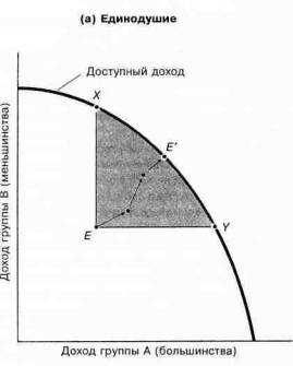 4. Общественный выбор преобразует совокупность индивидуальных предпочтений в коллективный выбор. При единодушии все решения должны приниматься только при всеобщем согласии. Единодушие обладает идеальным качеством, состоящим в том, что все решения представляют собой улучшения по Парето (при которых никто не пострадает), однако затраты на убеждение каждого настолько велики, что на практике ни одно решение не может быть принято при полном единодушии.