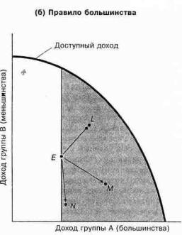 Каков же эффект, оказываемый коллективными решениями? На рис. 16-3 изображены некоторые из возможных эффектов. Для создания этой диаграммы мы использовали воображаемое общество, в котором существуют люди двух типов — А и В. Они могут быть богатыми и бедными, республиканцами и демократами, жителями деревни или города. Представим каждую группу как совокупность людей с однородными интересами и вкусами.