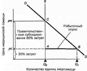 На рис.16-7 изображено неценовое нормирование на рынке медицинских услуг. Есть лишь Од единиц медицинских услуг, которые доступны для использования. Цена очищения рынка будет в точке С, где объемы спроса и предложения равны. Однако правительство оплачивает 80% всех медицинских расходов. Так как потребители оплачивают лишь 20% расходов, объем спроса будет равен q]. Отрезок А В представляет собой неудовлетворенный спрос, который подлежит неценовому нормированию; чем больше размер субсидий, тем в большей степени необходимо использовать неценовое нормирование.