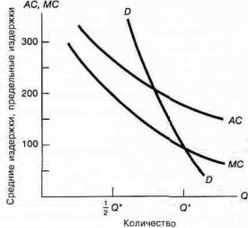 Для естественного монополиста кривая АС продолжает снижаться в точке, где она пересекается с отраслевой кривой DD. Таким образом, для обеспечения эффективности производства требуется, чтобы выпуск производился единственной фирмой. (Можете ли вы оценить, пользуясь данным графиком, насколько дороже был бы Q*, если бы он производился двумя фирмами, причем на долю каждой приходилось бы по 1/2 Q*?)