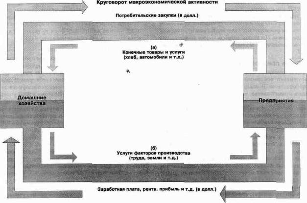 В верхней части показано, что люди расходуют свои деньги на конечные блага. Суммарный поток этих расходов в долларовом выражении является одним из измерителей валового внутреннего продукта. В нижней части отражен годовой поток издержек производства, т.е. заработки, которые выплачиваются предприятиями в виде заработной платы, ренты, процента, дивидендов и прибыли.