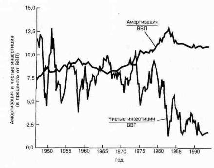 Рис. 22-3 иллюстрирует динамику чистых инвестиций и амортизации в виде процента от ВВП в течение последних пятидесяти лет. Доля амортизации немного возросла за этот период, главным образом потому, что инвестиции, имеющие сравнительно маленький жизненный цикл, стали составлять все большую часть американского капитального запаса. Доля выпущенной продукции, направляемая на чистые инвестиции, впе