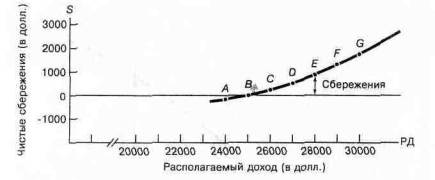 Точка постоянного богатства, в которой репрезентативное домашнее хозяйство ни сберегает, ни расходует сбережения, но потребляет весь свой доход, достигается при доходе, равном 25.000 долл. Ниже этой точки, скажем, при доходе, составляющем 24.000 долл., домашнее хозяйство фактически потребляет больше, чем это позволяет его доход; т.е. оно расходует свои сбережения (см. число -110)..Если же доход больше