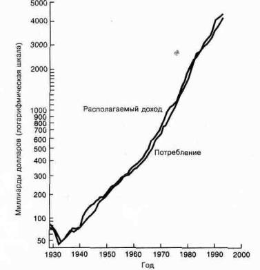 Рис. 23-6. Потребление и располагаемый доход, 1929-1993 гг.