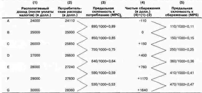 В колонке (3) представлены расходы на потребление при каждом уровне дохода. Поскольку каждый доллар дохода распределяется между потребляемой частью и остающейся сберегаемой частью, то показатели, приводимые в колонках (2) и (3), не независимы;
