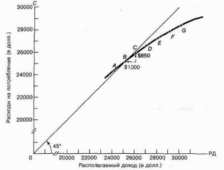 Кривая, проведенная через точки А, В, С, G является функцией потребления. На горизонтальной оси отложен уровень располагаемого дохода (РД). Для каждого уровня этого параметра функция потребления показывает уровень потребления (С) домашнего хозяйства (все данные в долларах). Обратите внимание на тот факт, что потребление увеличивается по мере роста РД. На 45 -ной линии расположена точка постоянного богатства; с помощью этой линии мы можем измерить чистые сбережения. Источник: таблица 23-3