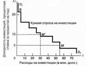 Результаты нашего анализа изображены на рис. 23-10, который иллюстрирует кривую спроса на инвестиций; она является здесь ступенчатым графиком функции, зависящей от ставки процента. Данный график показывает сумму инвестиций, которые будут осуществлены при той или иной процентной ставке; эта сумма вычисляется посредством сложения объемов инвестиций, которые будут прибыльны при каждой ставке процента.